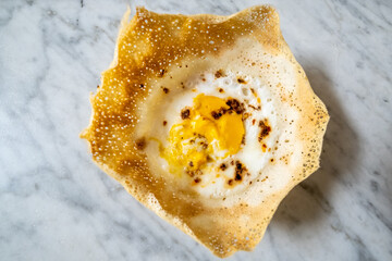Aapam is a South Indian delicacy made from fermented rice batter mixed with coconut, cooked rice, and a hint of sugar, creating a slightly sweet flavor. Cooked in a special pan, it forms a thin, crispy edge with a soft, fluffy center. Aapam pairs deliciously with coconut milk or savory curries.